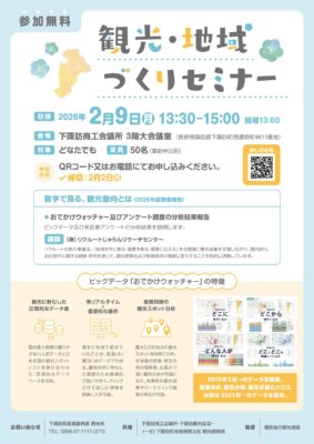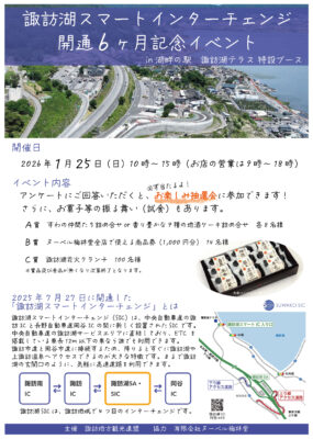 News ニュース 2026.01.22 下諏訪町 観光・地域づくりセミナー開催のお知らせ テーマ「数字で見る、観光動向とは」 2026.01.22 諏訪湖スマートインターチェンジ(SIC) 開通6ヶ月記念イベントの開催について 2025.12.26 2025年-2026年 諏訪地域 そば・うなぎ店 年末年始営業状況まとめ 一覧を見る